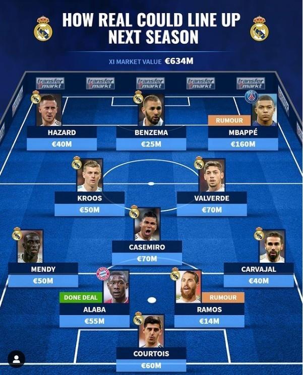 24直播网讯 皇马下赛季潜在首发(总身价6.34亿欧):