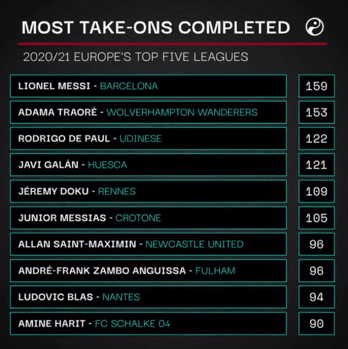 24直播网讯 Squawka统计了2020-21赛季五大联赛球员的过人次数排行榜,梅西159次成为欧洲过人王,狼队边锋阿达玛-特劳雷153次紧随其后,乌迪内斯攻击手德保罗122次排名第三。
