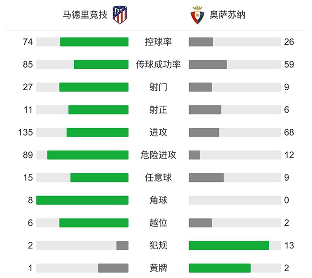 全场比赛结束,马德里竞技2-1奥萨苏纳。