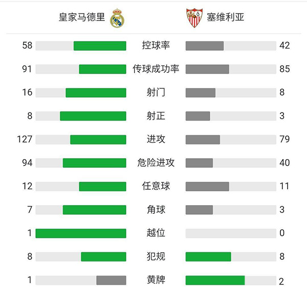全场比赛结束,皇家马德里主场2-2战平塞维利亚。
