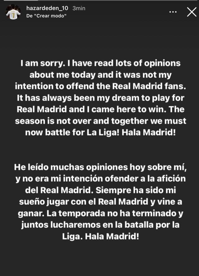 今天阿扎尔本人通过Instagram以英西双语进行了道歉。阿扎尔写道:“我很抱歉。今天我读了很多关于我的看法。我的本意并不是要冒犯皇马球迷。为皇马效力一直都是我的梦想,我来皇马是为了赢球的。这个赛季还没有结束,现在我们必须团结一致,为了西甲冠军而战。Hala Madrid!”