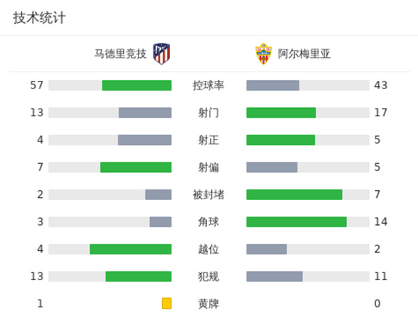 全场比赛结束,马竞2-1击败阿尔梅里亚。