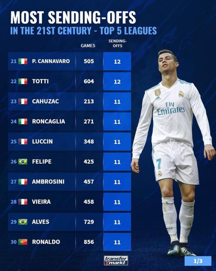 23、C罗(并列),葡萄牙,856场,11张红牌