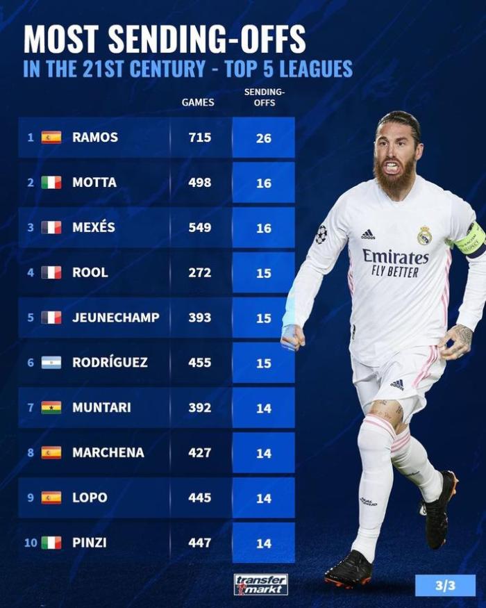24直播网讯北京时间4月18日,德国转会市场日前盘点了21世纪五大联赛拿红牌最多的球员,拉莫斯以26张红牌领跑该榜单。