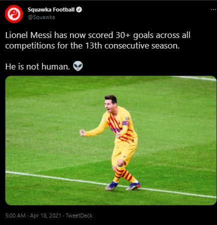 里程碑!梅西已经连续13个赛季进球数超30粒