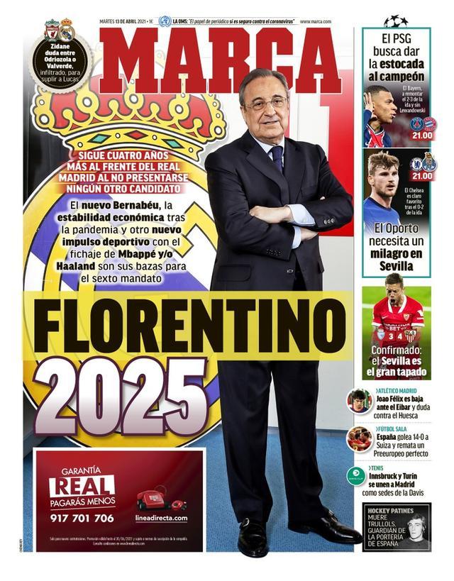24直播网4月13日讯据《马卡报》头版消息,弗洛伦蒂诺将第六次当选皇马主席,他将连任至2025年。