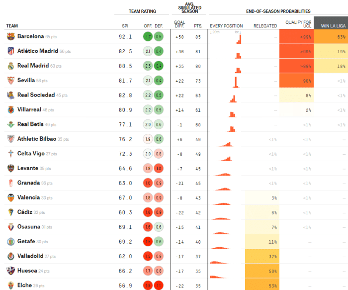 24直播网讯 西甲29轮过后,马竞在西甲积分榜上的领先优势已经变成了1分,这是所有人都没有想到的,此前马竞可以说是西甲夺冠最大的热门球队,他们曾经一度领先皇马、巴萨12分之多,但是现在马竞已经下滑了,他们虽然有积分优势,但是各大媒体已经不看好马竞夺冠了。近日,著名数据网站“538”更新了本赛季西甲夺冠几率,其中巴萨排名第一,而马竞仅排名第二,皇马位居第三。