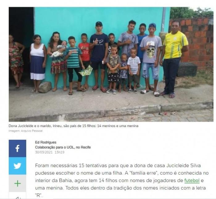 24直播网讯3月31日 据巴西媒体UOL报道,有一对来自巴西巴伊亚州的夫妇,因为热爱足球,生了15个孩子组足球队,名字均以“R”字母开头。