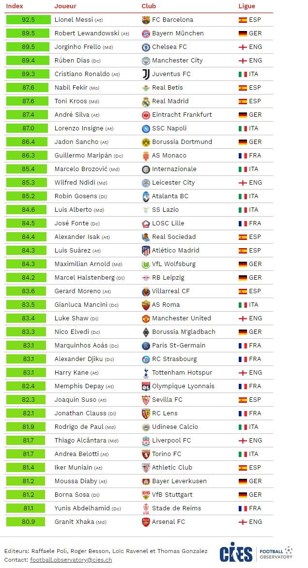 如图,梅西的评分是92.5分,他是唯一一名评分超过90分的球员,要知道在进入2021年之后,梅西在西甲赛场上12场比赛打进16球助攻7次,这样的表现绝对是世界级的,也难怪梅西能够排名第一。而排名第二的是莱万,他拿到了89.5分,在2021年莱万打进25球,是所有球员中进球最多的,不过效率方面比起梅西稍差一点。(制造进球的效率)和莱万并列第二的是若日尼奥,他的评分也是89.5分,当然若日尼奥更多的是组织进攻,数据就不罗列了。