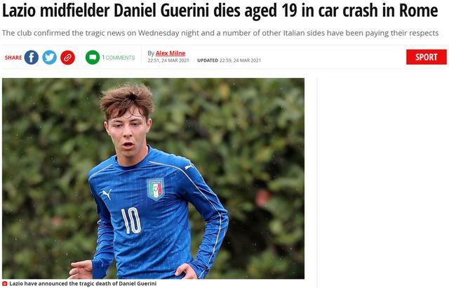 24直播网3月25日讯 据拉齐奥官方消息,球队小将丹尼尔-圭里尼离世,年仅19岁,根据媒体报道,这位小将因为遭遇车祸而不幸去世。
