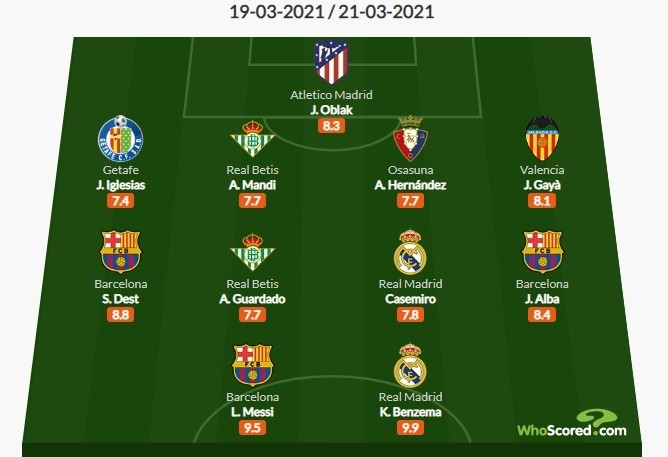 中场:德斯特(巴萨,8.8分)、瓜尔达多(贝蒂斯,7.7分)、卡塞米罗(皇马,7.8分)、阿尔巴(巴萨,8.4分)