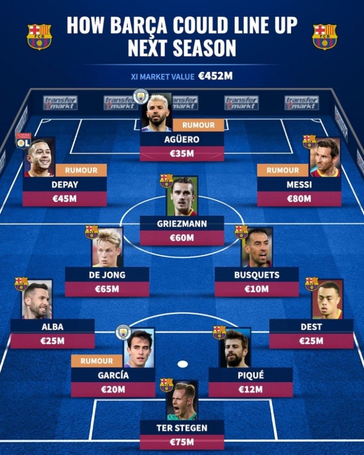 德转预测巴萨下赛季首发阵容:(总身价4.52亿欧)