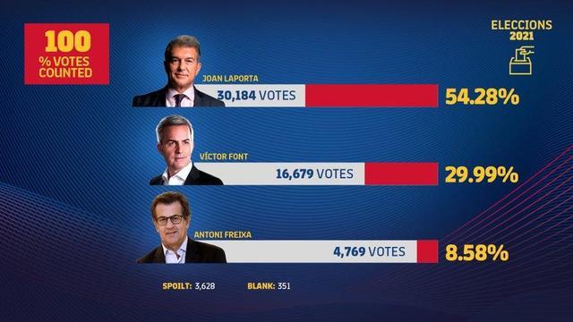 24直播网3月8日讯 据巴萨官方消息,拉波尔塔在主席大选中击败了弗雷萨和丰特,第二次担任俱乐部主席。