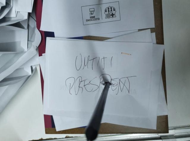巴萨今天宣布,拉波尔塔以压倒性的优势当选巴萨主席,但据科贝电台报道,在清点和检验选票时,巴萨发现有会员把票投给了乌姆蒂蒂。