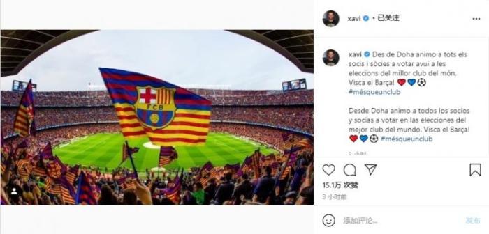 哈维写道:“人在多哈,我希望所有会员都参与到投票中来,为世界上最好的俱乐部选出一位主席,巴萨万岁!”