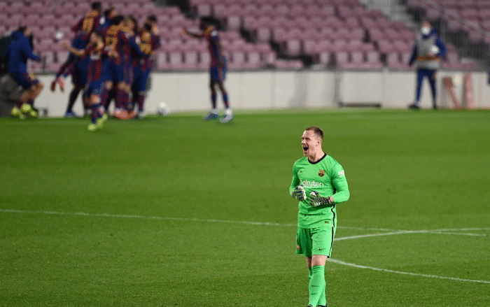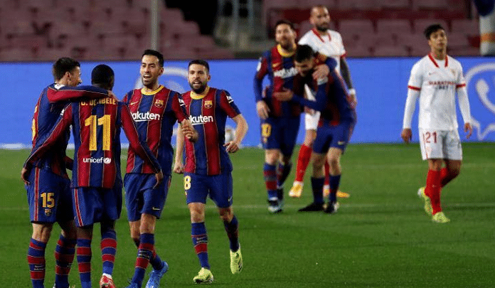 24直播网3月4日讯 国王杯半决赛次回合巴萨上演神奇逆转,他们在主场通过加时赛以3-0击败塞维利亚,总分3-2逆转对手,挺进到了本赛季国王杯决赛。这场比赛巴萨赢得非常惊险,登贝莱早早取得进球,但塞维利亚获得点球,好在特尔施特根神奇扑点成功,如果点球打进的话,巴萨需要再进3球才行。接下来神剧情出现,常规时间内第93分08秒,皮克进球扳平比分,比赛进入到加时赛。加时赛布莱斯维特头球为巴萨反超,巴萨顶住压力,成功晋级到国王杯决赛。