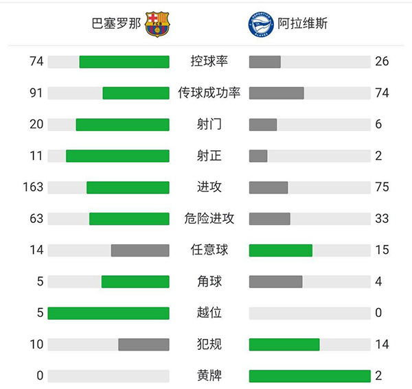 全场比赛结束,巴塞罗那5-1阿拉维斯。