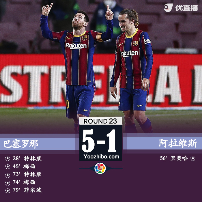 第81分钟,梅西送出挑传,格列兹曼横传门前,菲尔波打空门得手,巴塞罗那5-1阿拉维斯。