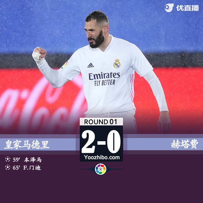 第60分钟,维尼修斯右路传中,本泽马高高跃起头槌破门,皇马1-0领先赫塔费