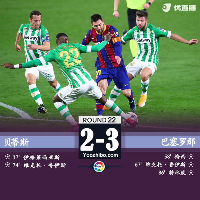 24直播网讯:北京时间2月8日04:00,西甲第22轮,巴塞罗那客场挑战皇家贝蒂斯。上半场阿劳霍伤退,博尔哈首开记录,朗格莱近距离头球顶偏。下半场梅西替补扳平比分,维克托-鲁伊斯先是自摆乌龙,随后头球破门,特林康绝杀。最终,巴萨3-2贝蒂斯。