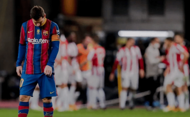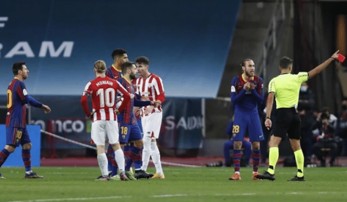 24直播网1月18日讯 今天对于巴萨的球迷们来说心情一定很糟糕,主队在西班牙超级杯决赛中2-3输给毕尔巴鄂竞技,无缘冠军,“大热必死”这样的言论在巴萨身上得到了佐证。比赛进行到最后时刻,梅西挥拳动作击倒比利亚利夫雷,被直接出示红牌罚下,这也是梅西在巴萨职业生涯的首张直接钟红牌。球队丢冠+梅西染红,这样的消息确实不能令巴萨的球迷们感到满意。