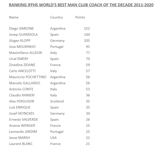 如图,IFFHS是按照过去十年间,每年的年度最佳主帅排名来计算分值的,第一20分,第二19分以此类推。而其中,西蒙尼的得分高达152分,高居榜首。毕竟,过去十年,西蒙尼每年都有稳定的表现,他的排名几乎稳居前十,所以这次位居榜首不令人意外。而第二的是瓜迪奥拉,他拿到了144分,第三是克洛普的105分。这里面,克洛普中间休息了一段时间,而瓜迪奥拉或许是因为球迷对他的要求太高了吧!