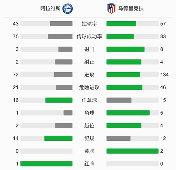 查看:阿拉维斯vs马德里竞技 全场录像技术统计: