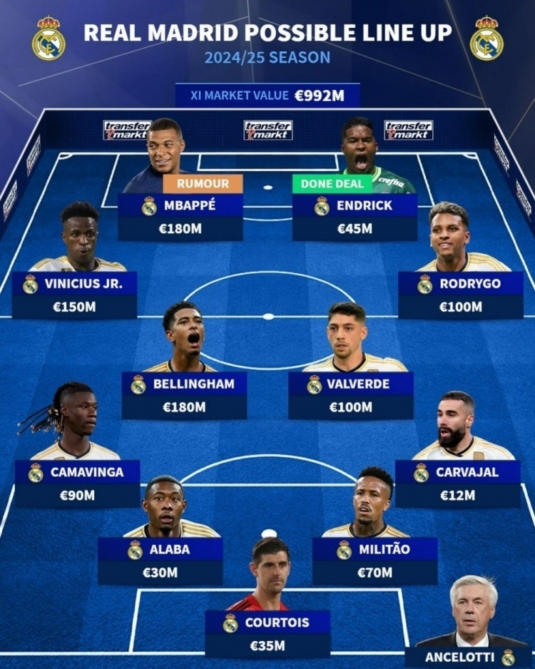 而在姆巴佩加盟皇马板上钉钉之后,皇马下赛季的首发豪阵也呼之欲出。在这套4-2-2-2的阵型中,姆巴佩和17岁的巴西天才恩德里克将搭档锋线。两位巴西快马罗德里戈和威尼休斯将会坐镇边路。