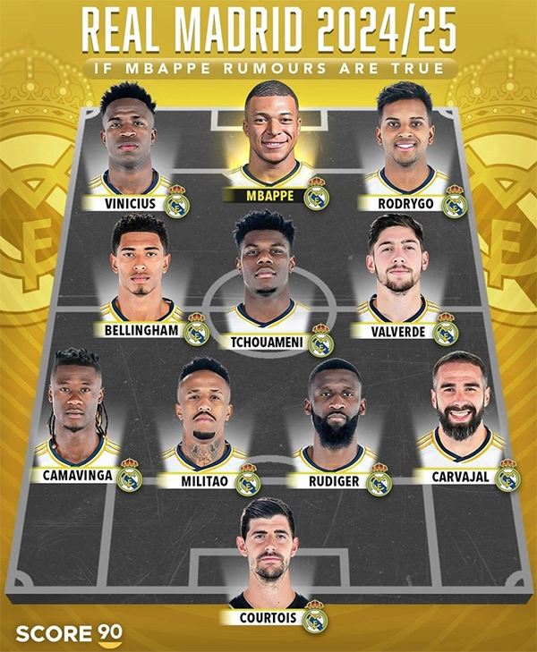 24直播网讯 北京时间6月4日凌晨,西甲豪门皇家马德里官方正式宣布,25岁的法国天才姆巴佩自由身加盟,双方将签约5年。而随着姆巴佩加盟,外媒也列出了皇马下赛季的首发预测,阵容可谓豪华至极,堪称新版“银河战舰”。