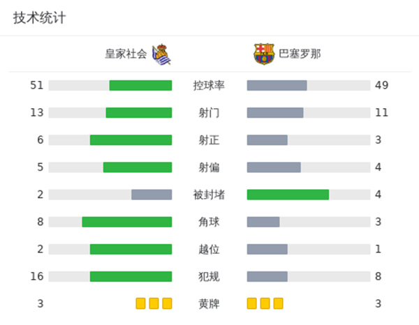 关键事件: 第90+2分钟,京多安挑传禁区,阿劳霍前插头球破门,主裁判示意此球越位,VAR介入,随后主裁判判罚进球有效,巴萨1-0皇家社会。