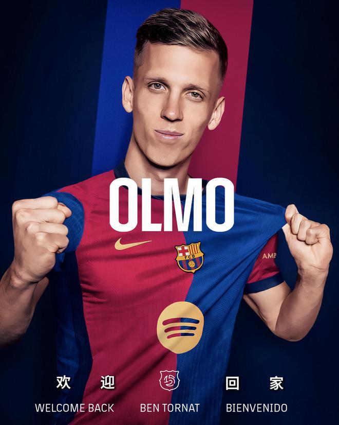 24直播网讯 8月9日官方消息,巴塞罗那足球俱乐部成功签下 26 岁的西班牙国脚达尼 - 奥尔莫,转会费总价 6200 万欧,双方签约至 2030 年,解约金 5 亿欧。