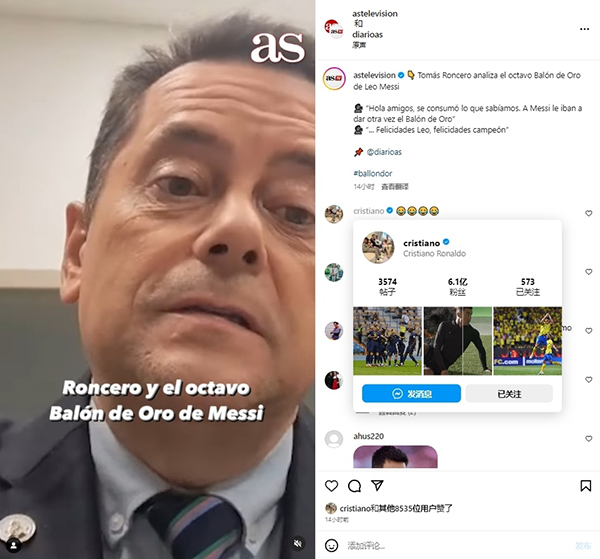 而龙赛罗这段颇具争议的视频,引来了C罗本人的关注。C罗第一时间点赞该动态,并且还配上了5个“笑哭”的表情包,表示认可。如果像龙赛罗所说的那样,梅西至少3个金球奖名不副实,那么他与C罗的金球奖数将会“持平”。GOAT之争,或许依然不会有最终的定论。