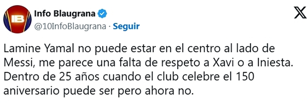 有球迷表示:“不该把亚马尔放在梅西身边,我认为这是对哈维和伊涅斯塔的不尊重。或许再过25年,等到150周年庆典时亚马尔配得上,但现在还不行。”