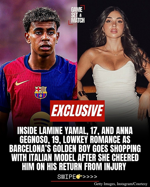 24直播网讯北京时间12月2日晚,来自外媒的报道,17岁的巴萨红星亚马尔又有了新的对象,他的新女友是19岁的意大利模特Anna Gegnoso。