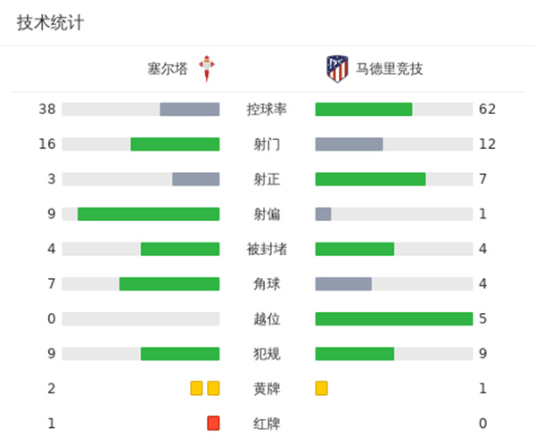 双方出场阵容: 塞尔塔首发:13-比利亚尔、4-乌奈-努涅斯、3-明格萨、2-斯塔费尔特、20-凯文-巴斯克斯(28’25-瓜伊塔)、17-班巴、8-贝尔特兰(61’30-索特洛)、14-德拉托雷(81’6-多托尔)、23-马努-桑切斯、18-J-拉尔森(81’29-米格尔-罗德里格兹)、10-阿斯帕斯(61’12-杜维卡斯) 替补未出场:11-弗兰科、5-塔皮亚、1-马尔切辛、28-卡洛斯-多明格斯、19-斯威德伯格 马竞首发:13-奥布拉克、3-阿斯皮利奎塔、22-埃尔莫索、12-利诺(46’16-莫利纳)、14-马科斯-略伦特(57’10-科雷亚)、6-科克、8-萨乌尔(57’5-德保罗)、24-巴里奥斯(46’25-里克尔梅)、7-格列兹曼(77’4-瑟云聚)、19-莫拉塔 替补未出场:1-格尔比奇、17-加兰、31-戈米斯、27-科斯蒂斯