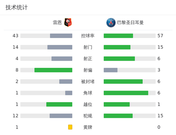 最终全场比赛结束,巴黎3-1客胜雷恩。