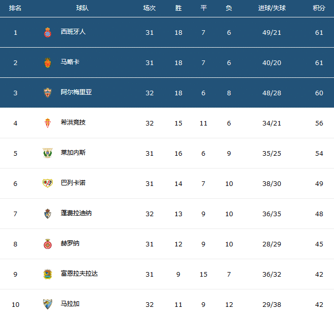 24直播网讯北京时间3月31日,西乙联赛第32轮打响,排名积分榜前五的队伍完成了两场比赛,西班牙人的冲甲2大劲敌阿尔梅里亚和希洪竞技双双赢球,阿尔梅里亚以3-0完胜马拉加,从而实现了大反弹,终结了最近3轮不胜的尴尬,积分榜冲马略卡和西班牙人施加压力,达到了60个积分,马略卡和西班牙人则以61分领跑积分榜。