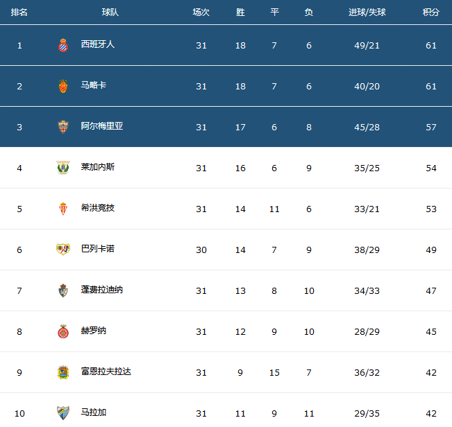 24直播网3月30日讯2021年3月底,西乙联赛已经完成了第31轮的所有比赛,积分榜形势突变,最近一度跌出积分榜前二即直接冲甲区的西班牙人意外逆袭重夺榜首位置,这种逆袭一方面是西班牙人自身近期的两连胜,一方面则是西班牙人4大冲甲死敌的雪崩间接保送西班牙人夺取榜首。