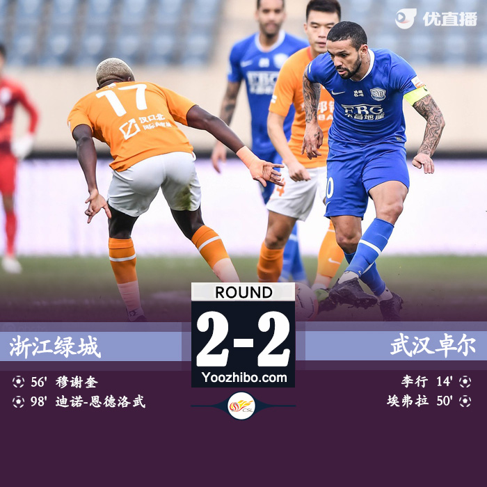24直播网讯:北京时间11月18日晚19时35分,中超升降级附加赛首回合,浙江绿城与武汉卓尔展开较量。上半场巴普蒂斯唐助攻李行首开纪录,迪诺头球造险埃弗拉补时破门扩大比分。下半场穆谢奎破门扳回一球,比赛最后时刻绿城获得点球机会,迪诺命中绝平,最终双方2-2战平。