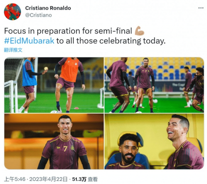 C罗在社交媒体上晒出了自己和全队努力训练的照片,表示:“专注于备战半决赛,祝所有庆祝开斋节的人节日快乐。”