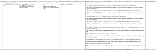 24直播网12月11日,亚足联公布了对亚冠第5轮浙江队VS武里南队赛后的冲突处罚。浙江队5人被处罚,6号姚均晟禁赛8场、19号董宇禁赛6场、45号莱昂纳多禁赛8场、技术分析师王剑禁赛6场。浙江队助教哈维尔-佩雷斯-阿尔马尔扎被禁赛1场,罚款1000美元。此外,浙江俱乐部还被罚款1万美元。