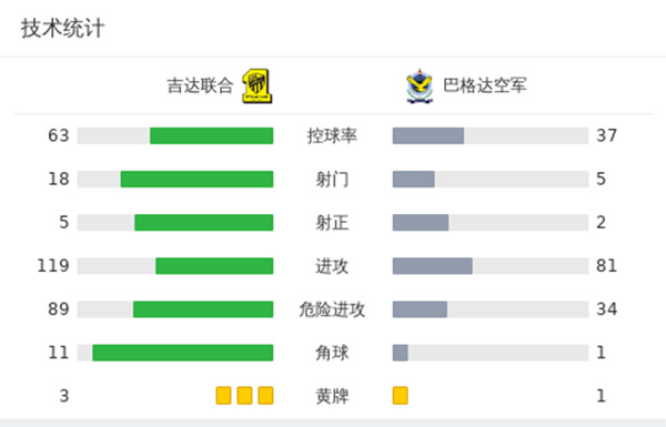 关键事件: 第93分钟,坎特前场右路传中,哈姆达拉禁区内停球低射打进绝杀,吉达联合1-0巴格达空军。