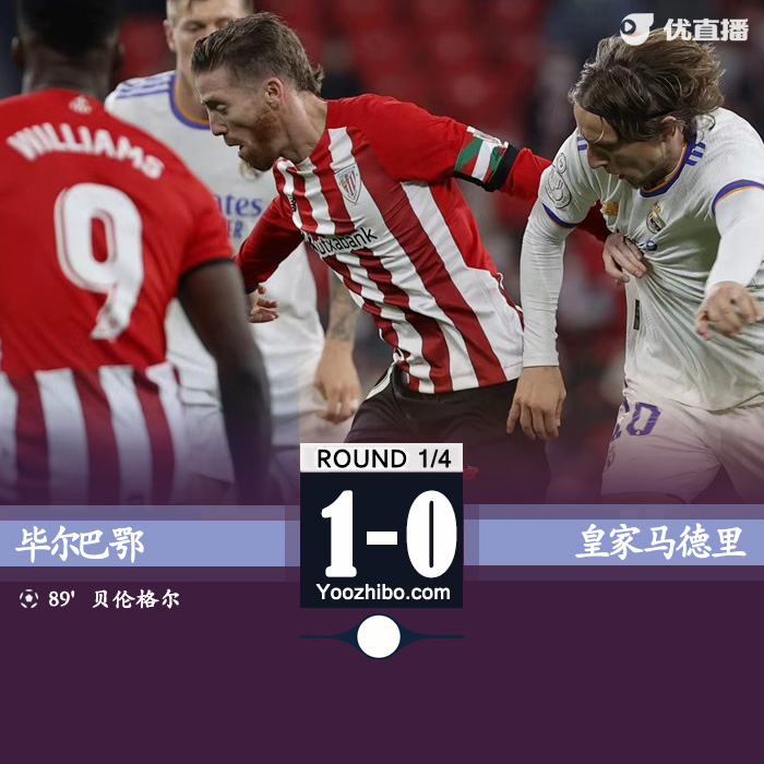 24直播网2月4日讯 北京时间2月4日凌晨4点30分,2021-22赛季西班牙国王杯1/4决赛在圣马梅斯球场展开角逐,皇家马德里客场挑战毕尔巴鄂竞技。上半场双方均无建树,下半场卡塞米罗失良机,皇马后场连续失误致丢球,贝伦格尔绝杀。最终皇家马德里客场0-1负于毕尔巴鄂竞技,皇马无缘国王杯四强。