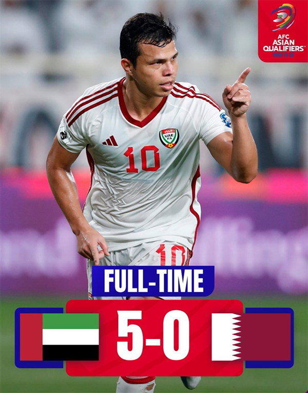 尤其是本场比赛,卡塔尔在客场竟然被阿联酋“暴打”。卡塔尔在客场开场4分钟便率先丢球,阿联酋射手法比奥-利马禁区抽射破门。此后利马在半场结束前连进2球并且在第56分钟主罚点球命中,本场比赛上演了大四喜。随着加萨尼在第73分钟为阿联酋再进1球,最终卡塔尔在客场0-5惨败。