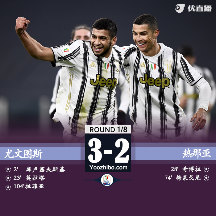 24直播网1月14日讯 北京时间1月14日4:15,意大利杯1/8决赛,尤文迎战热那亚。上半时库卢塞夫斯基斩传射,莫拉塔破门,茨博拉扳回1球,尤文两粒进球越位在先无效。下半时皮亚察中框,梅莱格尼扳平比分。90分钟战罢2-2双方进加时,加时上半时莫拉塔达成传射助拉菲亚破门,加时下半时阿图尔门线救主。最终,尤文3-2热那亚晋级,尤文1/4决赛将对阵萨索洛与斯帕尔之间的胜者。