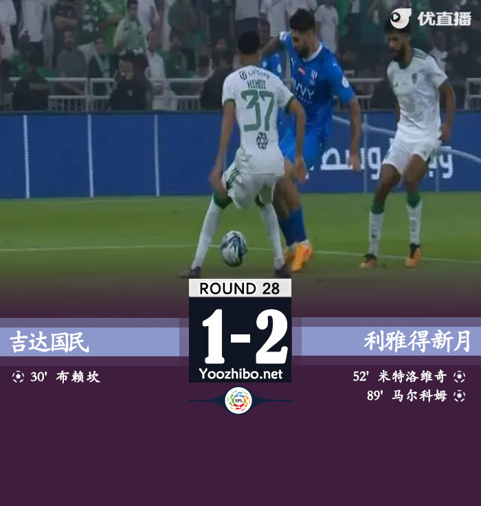24直播网讯:北京时间5月7日凌晨2时整,2023-24赛季沙特联第28轮补赛展开角逐,吉达国民坐镇主场迎战利雅得新月,上半场马赫雷斯中柱,布赖坎打破僵局,下半场米特洛维奇头球扳平,马尔科姆一条龙绝杀。最终利雅得新月客场2-1逆转吉达国民,新月联赛30轮不败,积分榜方面,新月领先第2名胜利12分居榜首,再拿1分即夺冠,国民积55分位列第3。