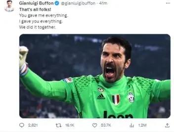 24直播网讯08月03日,现年45岁的意大利传奇门将布冯在社交媒体上宣布退役,并发布视频。