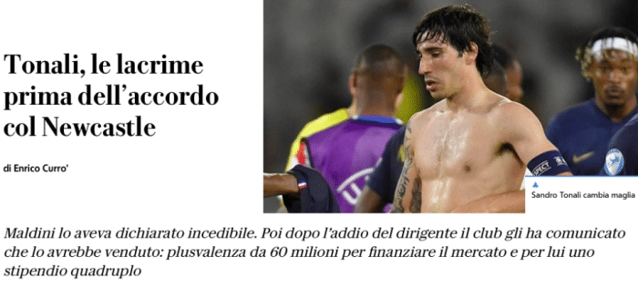 据悉,托纳利一直希望像保罗-马尔蒂尼那样,终生效力米兰,成为红黑军团的旗帜性球员。而马尔蒂尼也曾表示过托纳利是非卖品,但马尔蒂尼在本月初离职,托纳利也被俱乐部方面告知非常希望他能够转会去纽卡斯尔,这样球队能够收到7000万欧元。这一消息也让托纳利备受打击,他在得知这一消息后痛哭流涕。