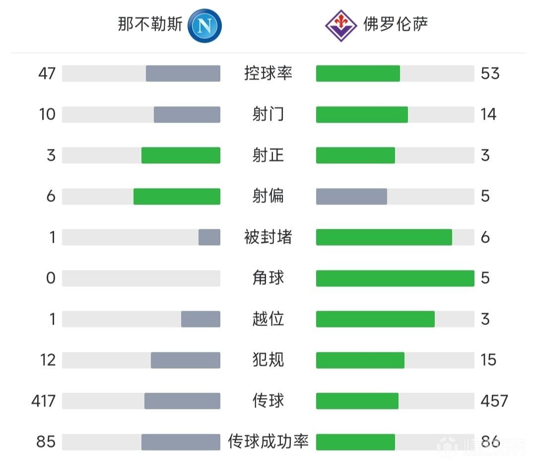 关键事件: 第70分钟,那不勒斯再次取得点球!K77左路禁区内切被冈萨雷斯放倒裁判判罚点球,随后奥斯梅恩主罚点球破门,那不勒斯1-0佛罗伦萨。
