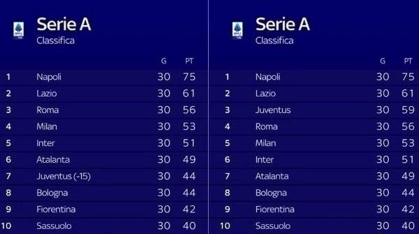 而随着尤文被扣除的15个积分归还,意甲积分榜上,尤文的联赛积分将变为59分,从而从第7的位置,直接上升至联赛第3位,力压穆帅执教的罗马。罗马以3分之差暂列第4位。而本赛季打进欧冠4强的米兰双雄,则因为尤文上诉的暂时成功,成为受害者。在积分榜上分别以53分和51分退居第5和第6位。